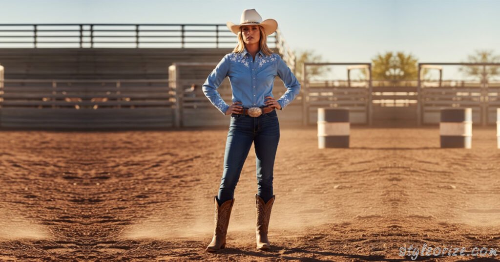 Picture a confident woman standing in a dusty rodeo arena, boots planted firmly, outfit styled with purpose. A feature image like this instantly captures the bold spirit of rodeo outfits women wear and sets the tone for the rest of the style journey.